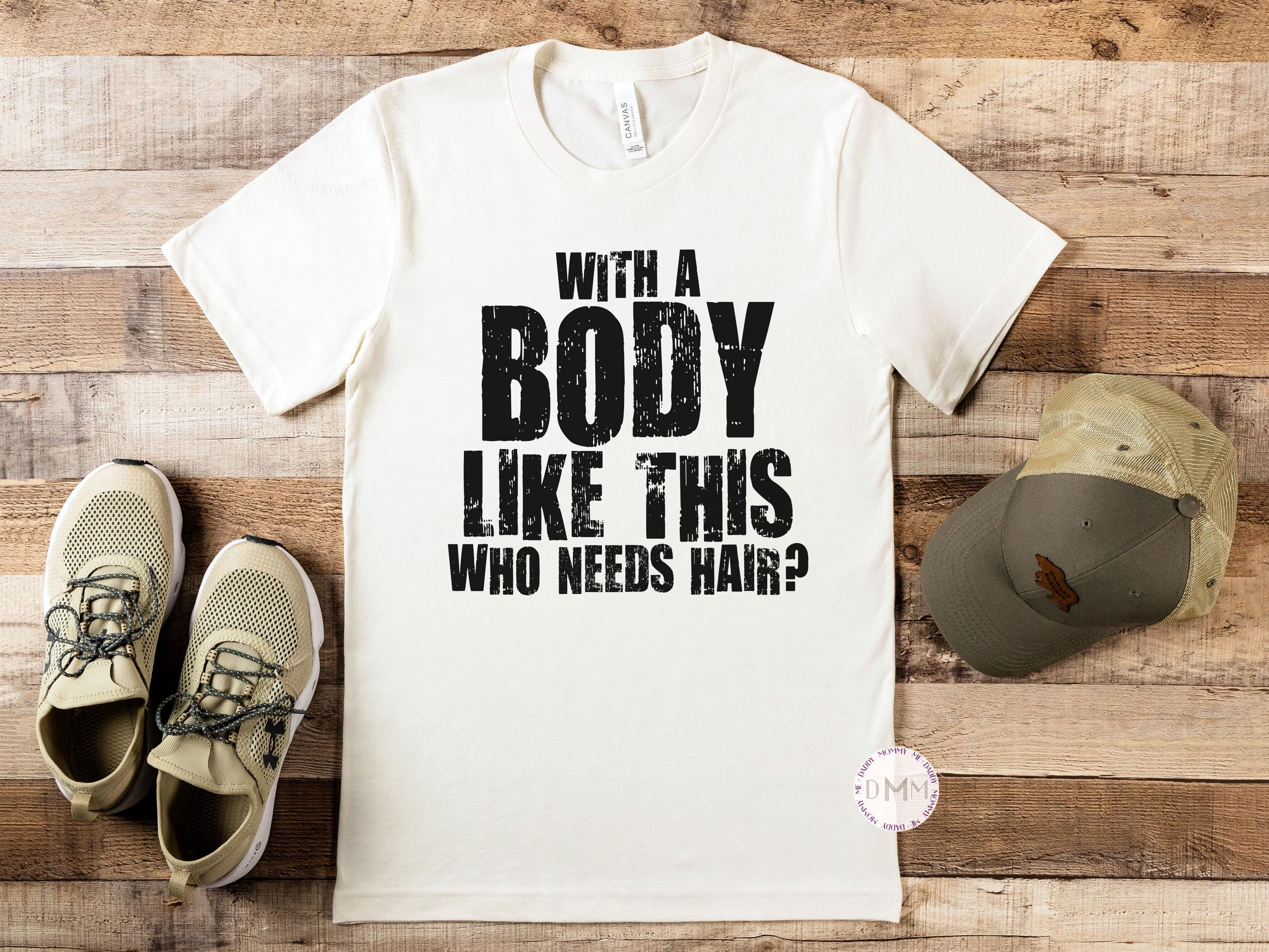 Funny Bald Guy Shirt – “With a Body Like This Who Needs Hair?” – Humor Graphic Tee – Gift for Bald Men – Confident Dad Husband Gift