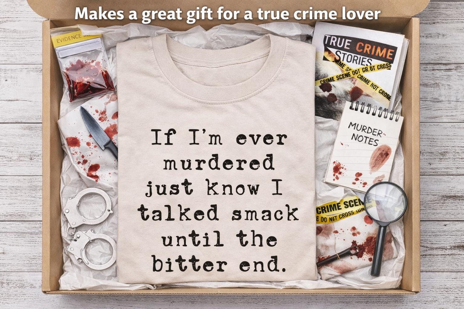 If I’m ever murdered just know I talked smack until the bitter end – the perfect funny true crime shirt for sarcastic personalities and crime podcast lovers. If your personality is a little sarcastic… a little unfiltered… and very into true crime — this shirt was made for you.