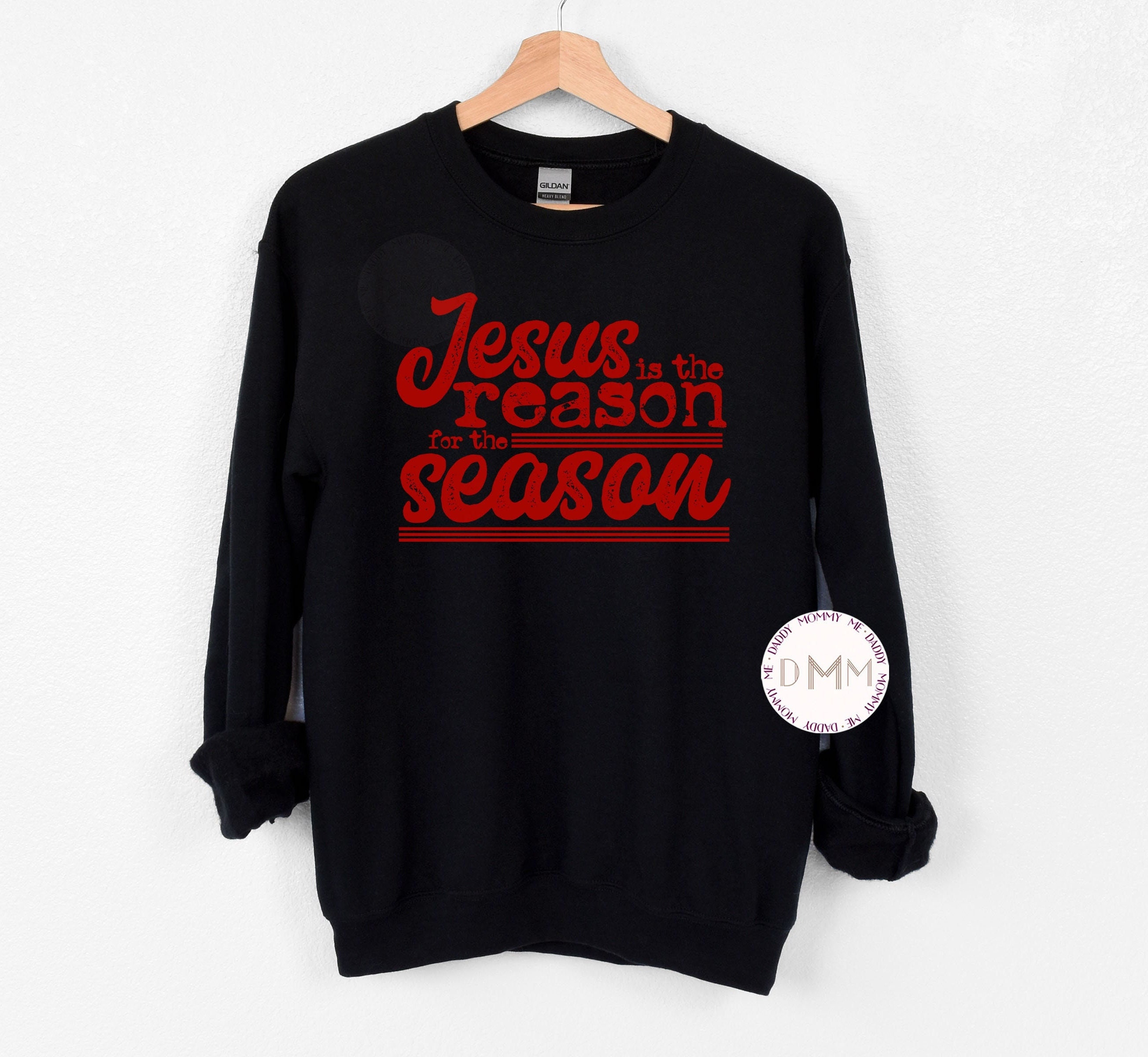 Jesus Is The Reason For The Season Sweatshirt. Graphic design in red - screen print