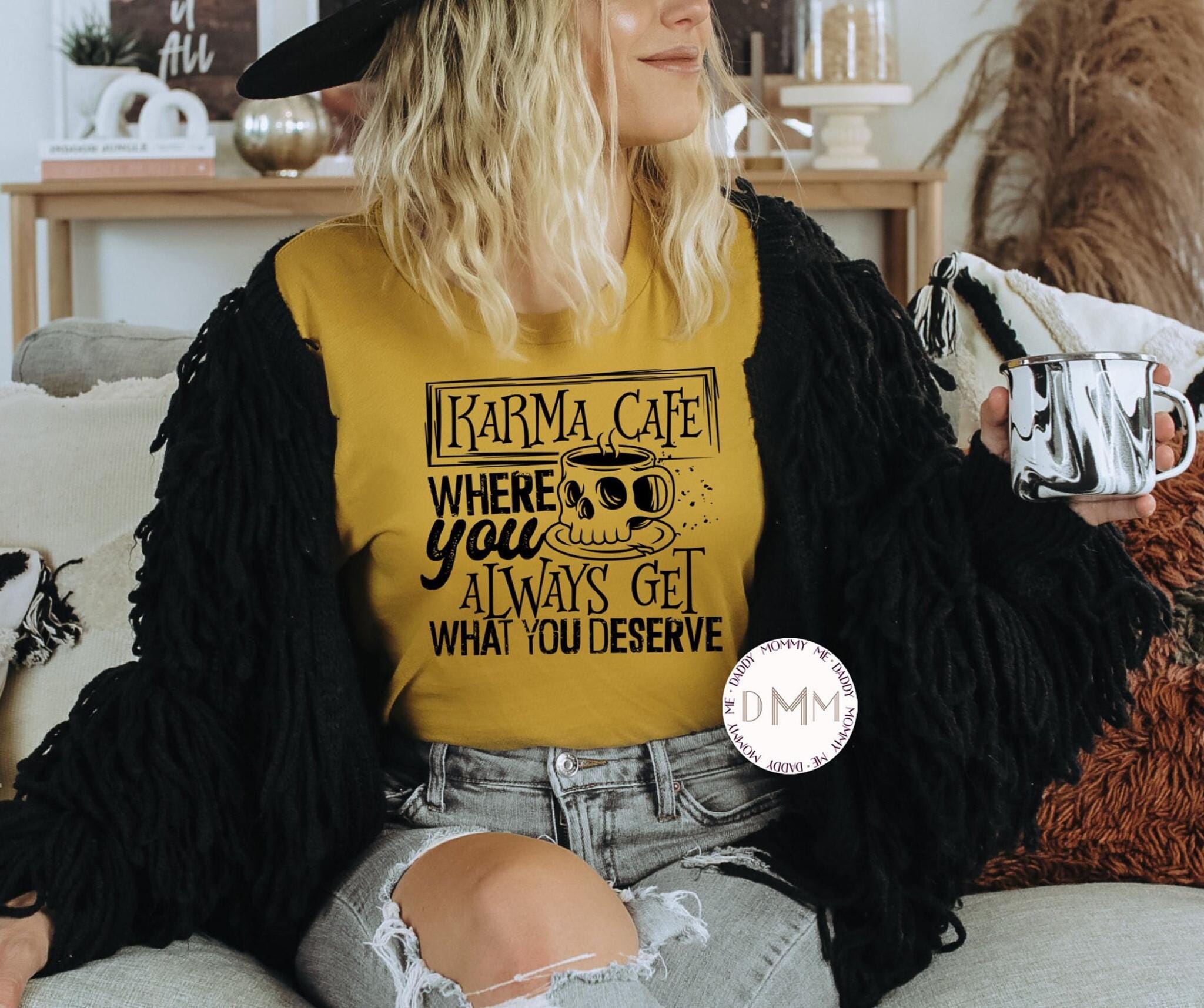 Karma Cafe Where You Always Get What You Deserve Shirt - Funny Shirts For Women - Unisex Graphic Tee Women - Funny Karma Shirt - Coffee Tee