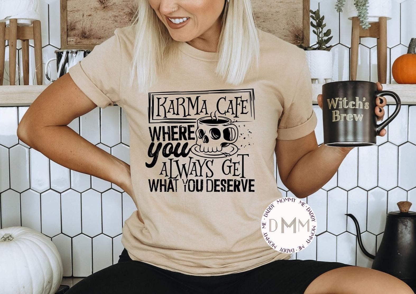 Welcome to the Karma Cafe — where you always get what you deserve. This bold, sarcastic graphic tee blends humor with a touch of dark aesthetic, making it perfect for anyone who loves witty sayings, witchy vibes, or spooky season style. Whether you're sipping your morning coffee or serving karma all day long, this shirt makes a statement.