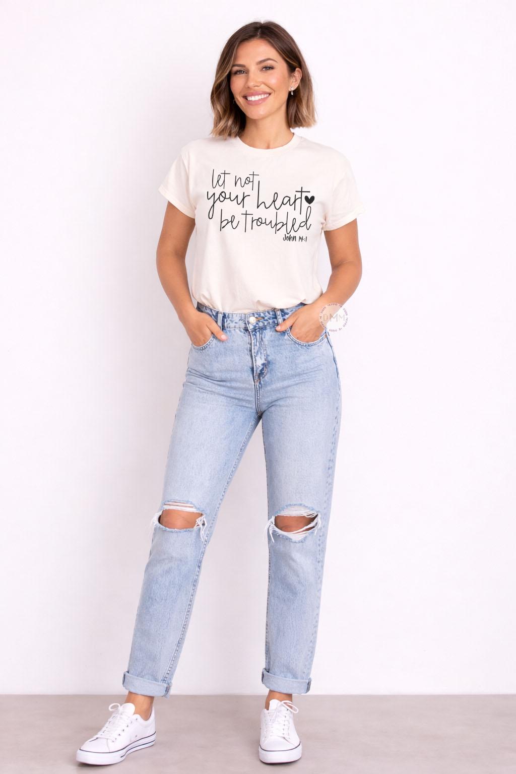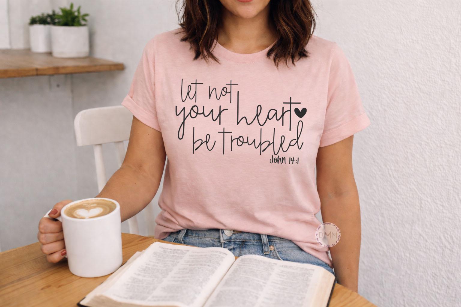 Christian Bible Verse Shirt – John 14:1 Let Not Your Heart Be Troubled – Faith Shirt – Christian Gift for Women – Scripture Tee – Church Shirt – Inspirational Shirt