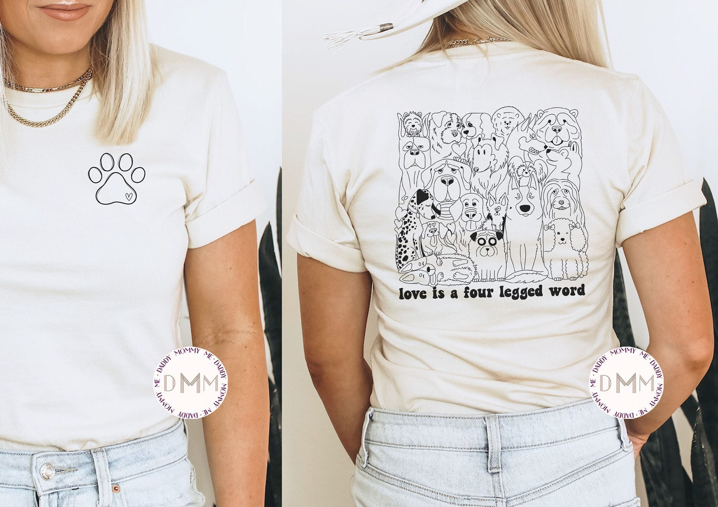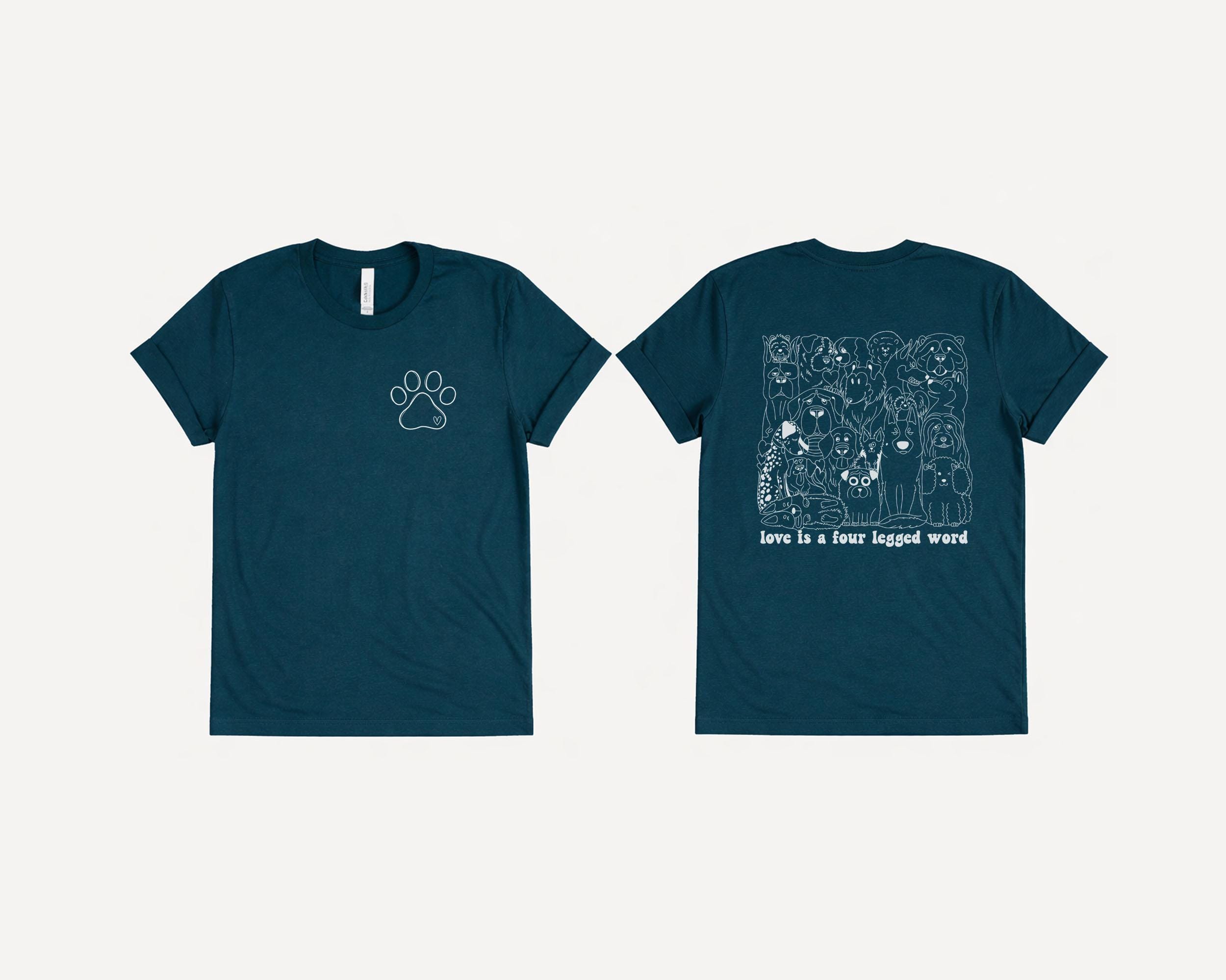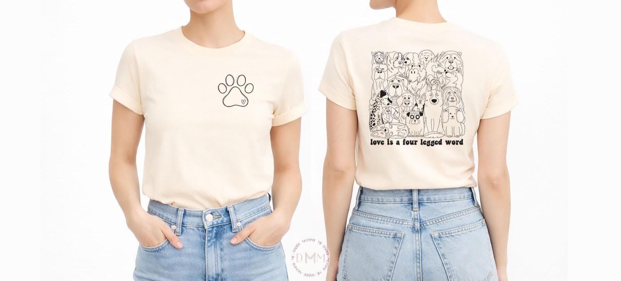 Because love really is a four-legged word. Cozy, stylish dog lover tee with a minimal paw print on the front and an adorable dog illustration collage with the phrase “Love Is a Four Legged Word” on the back — perfect for dog moms, pet lovers, and anyone whose heart belongs to pups.