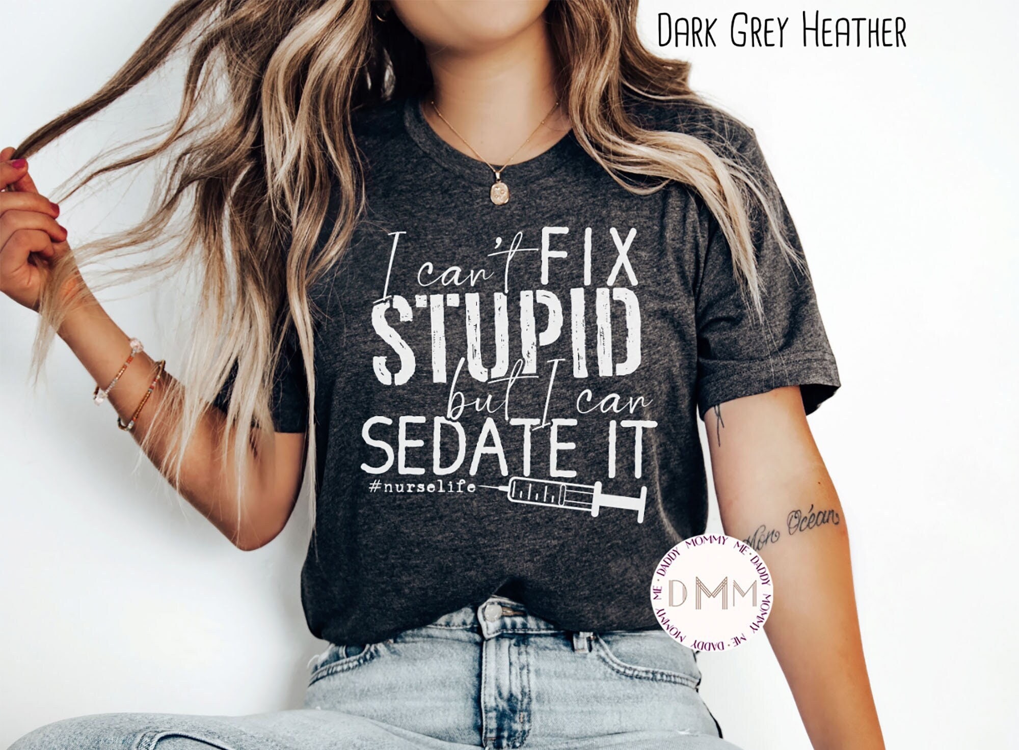I Can't Fix Stupid But I Can Sedate It Nurse Life Shirt. Graphic design in white - screen print