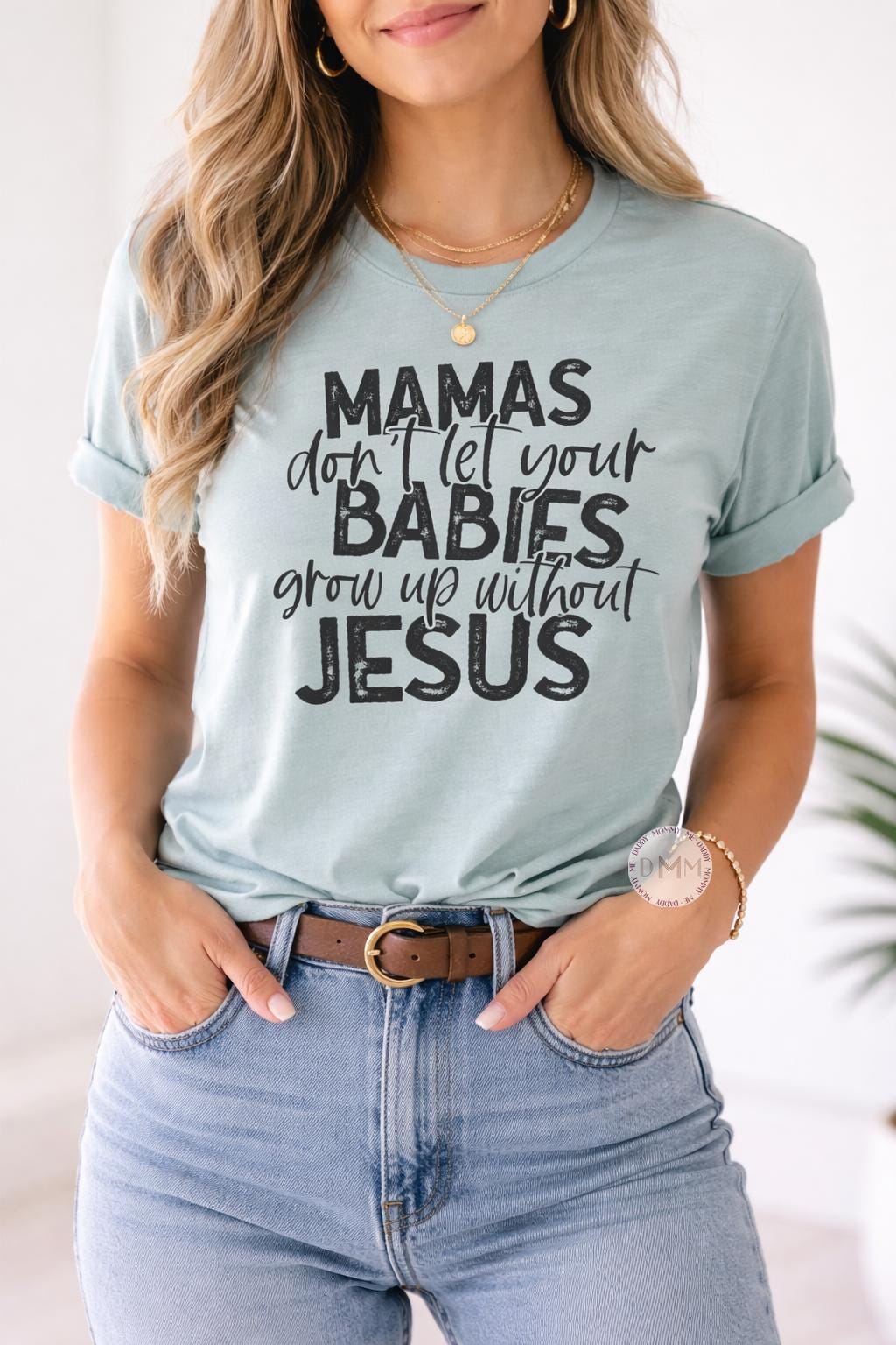 This Christian mama t-shirt features the powerful message, “Mamas Don’t Let Your Babies Grow Up Without Jesus” — perfect for moms who proudly wear their faith.