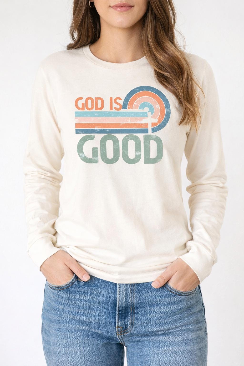 Wrap yourself in faith and encouragement with this “God Is Good” retro-inspired shirt. Designed with a soft vintage rainbow and cross graphic, this piece is perfect for everyday wear, church, Bible study, or gifting to someone who loves faith-forward style.