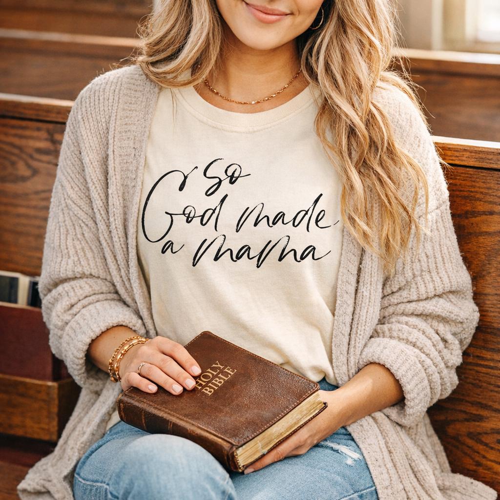 So God Made a Mama. A beautiful reminder of faith, motherhood, and purpose — printed on a premium Comfort Colors tee for that soft, lived-in feel everyone loves.