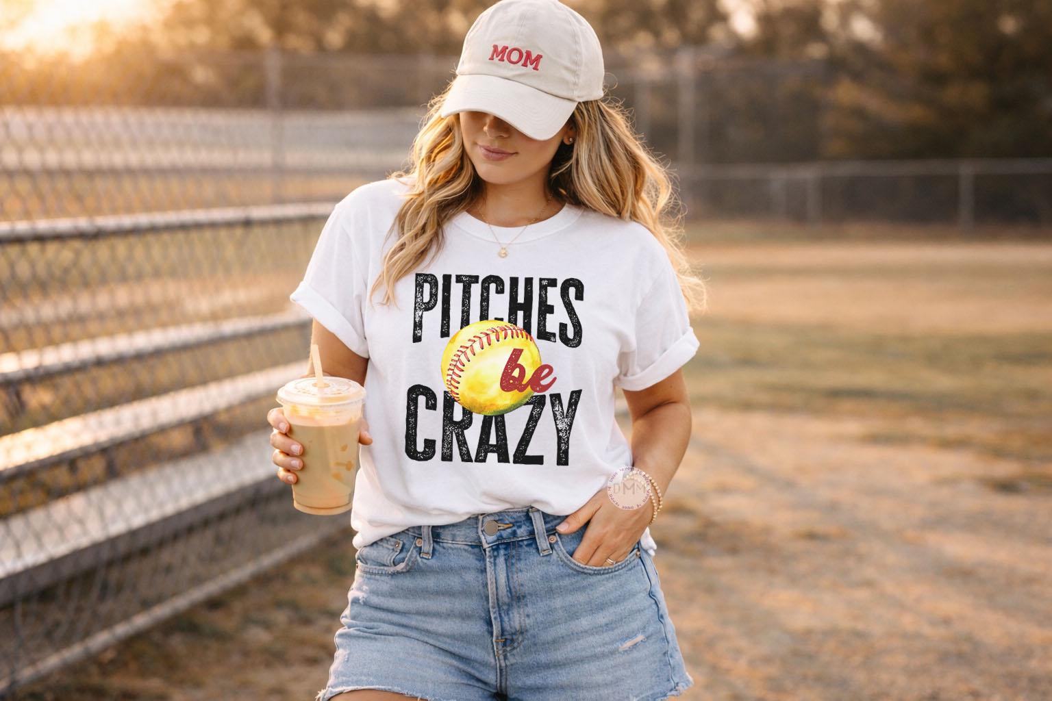 Funny softball shirt for game day! “Pitches Be Crazy” Comfort Colors tee — perfect gift for softball moms, players, and fans.