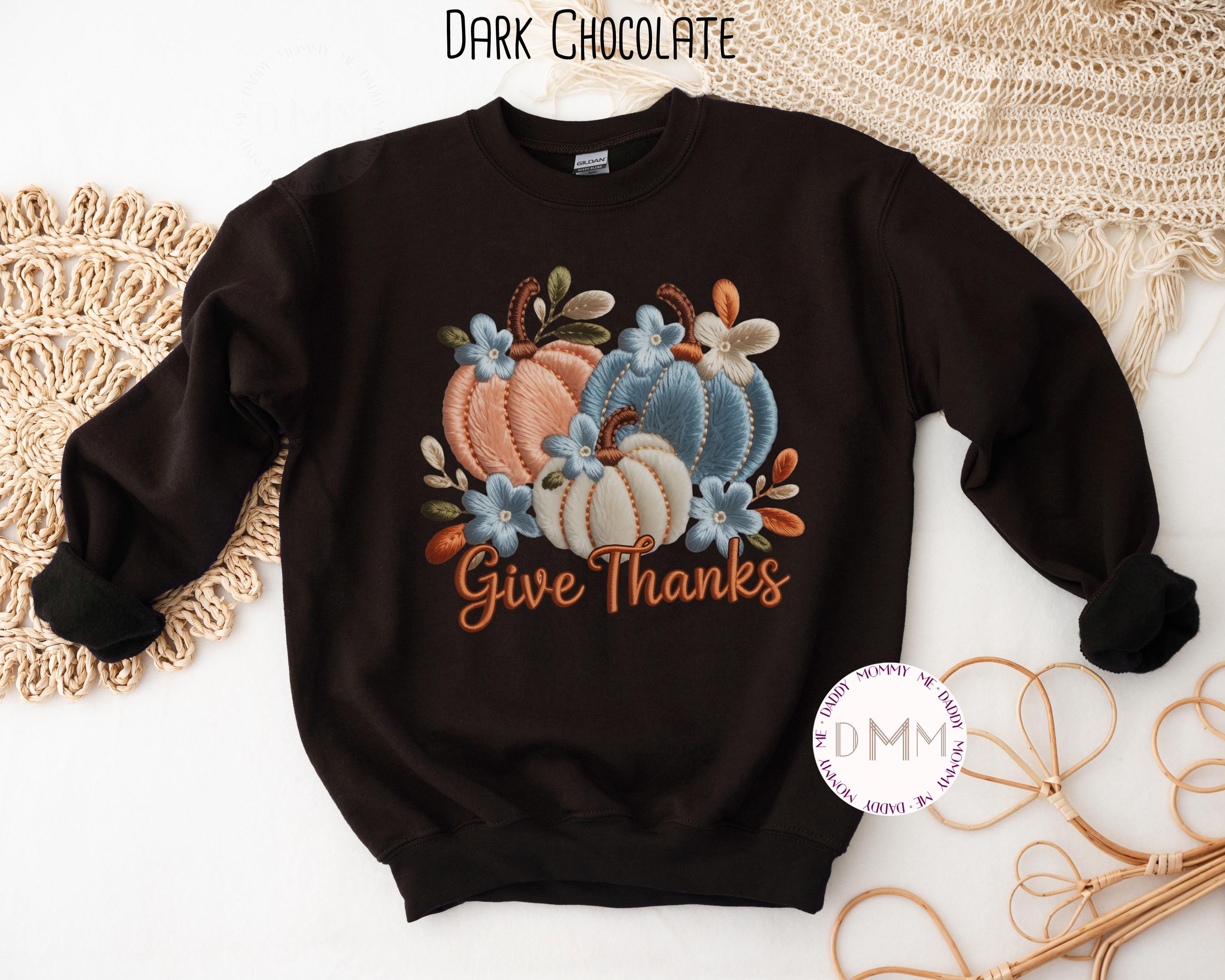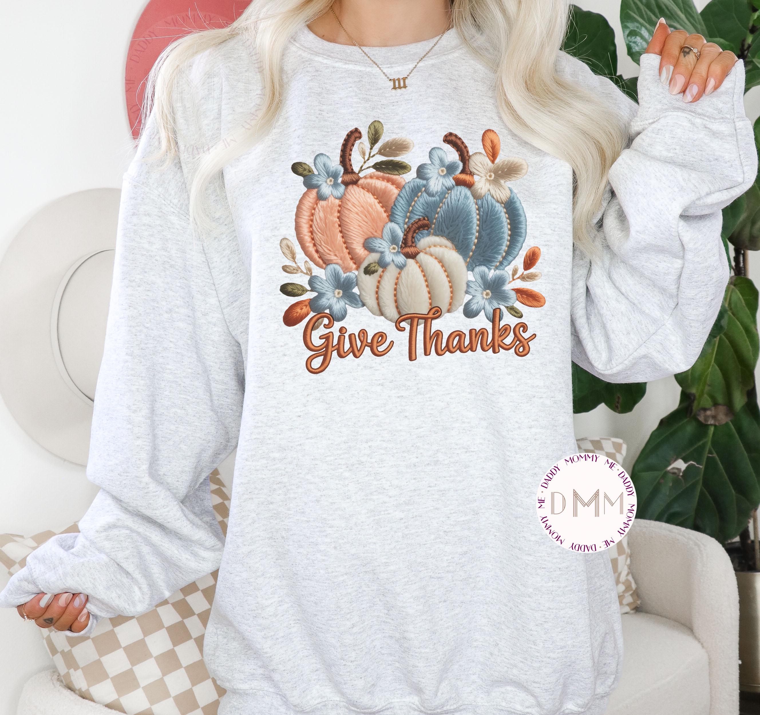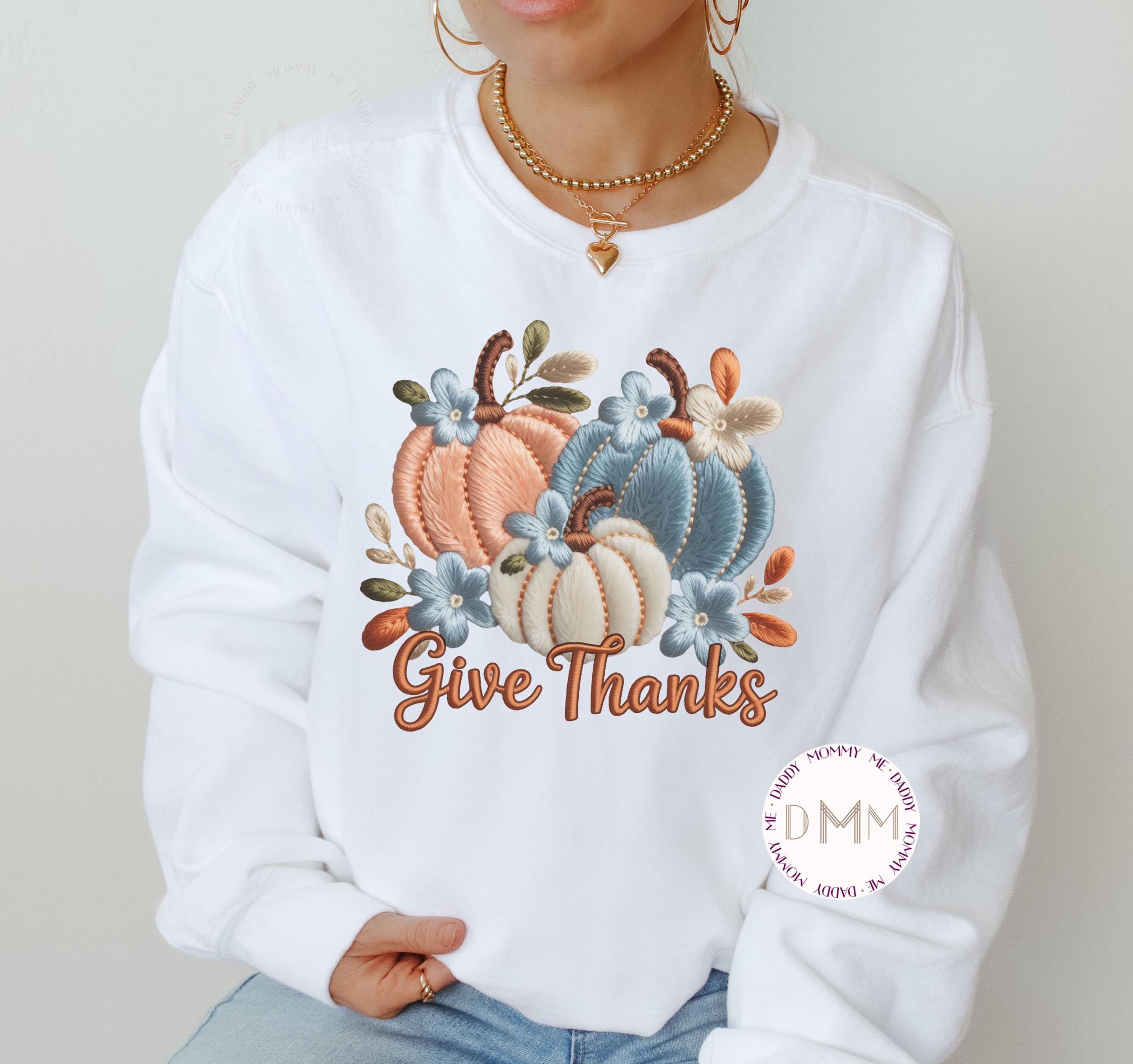 Give Thanks Faux Latch Hook Yarn Sweatshirt, Faux Embroidery Thanksgiving Pumpkin Sweater, Trendy Holiday Faux Crochet Sweatshirt