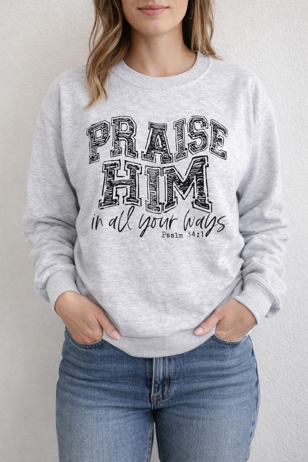 Praise Him Sweatshirt | Christian Sweatshirt for Women | Psalm 34:1 Bible Verse Sweatshirt | Faith Based Clothing | Trendy Christian Apparel