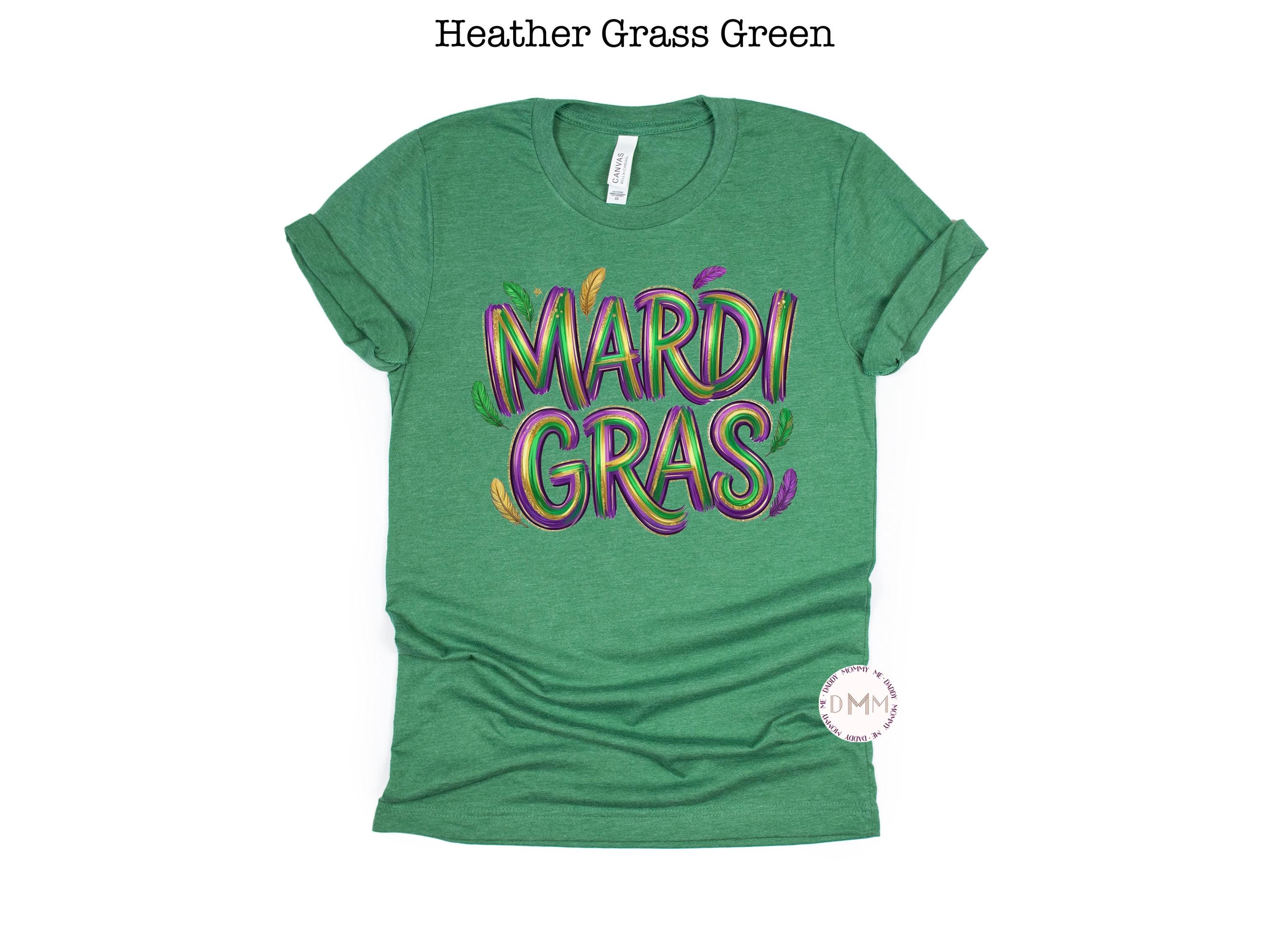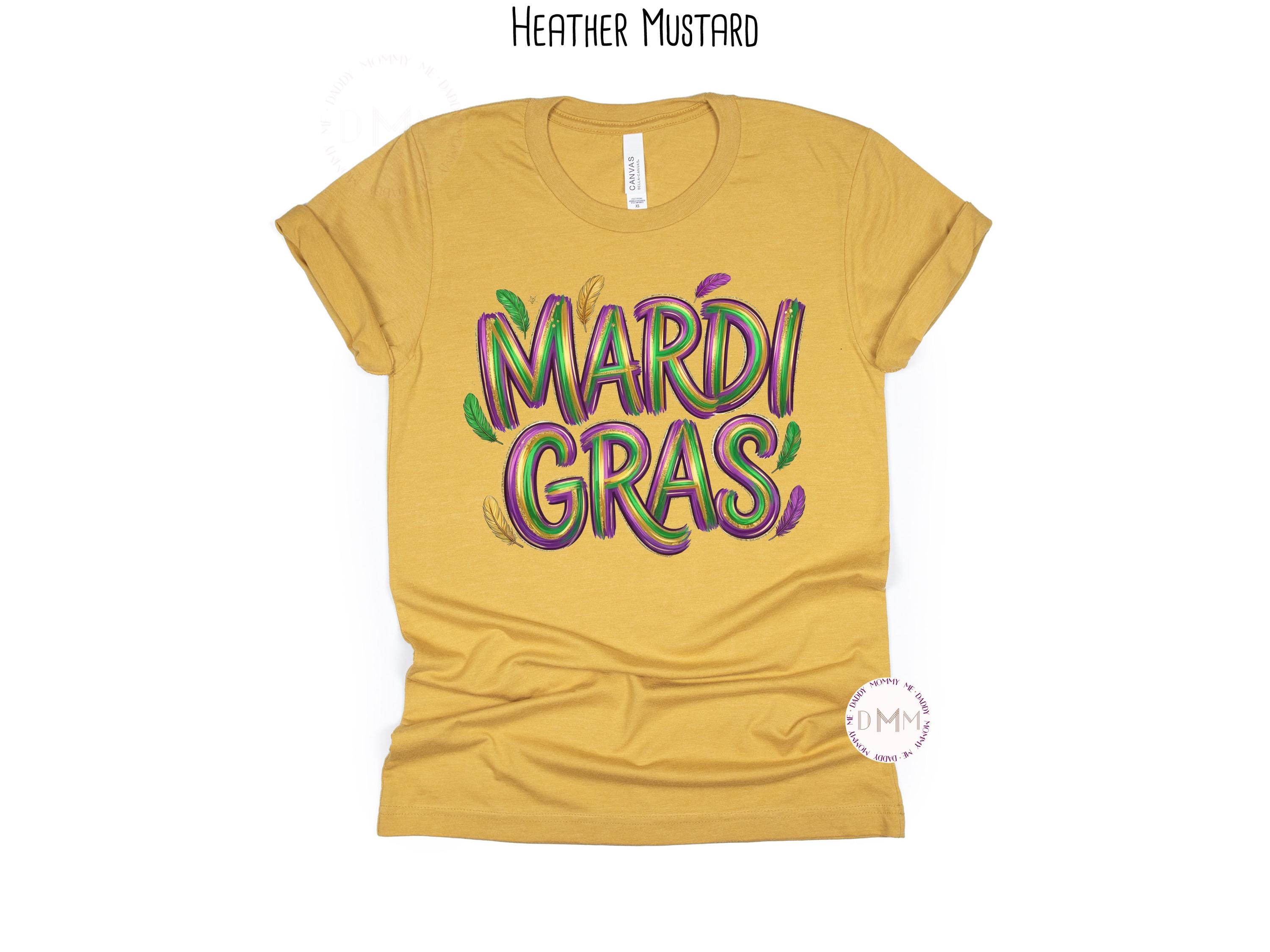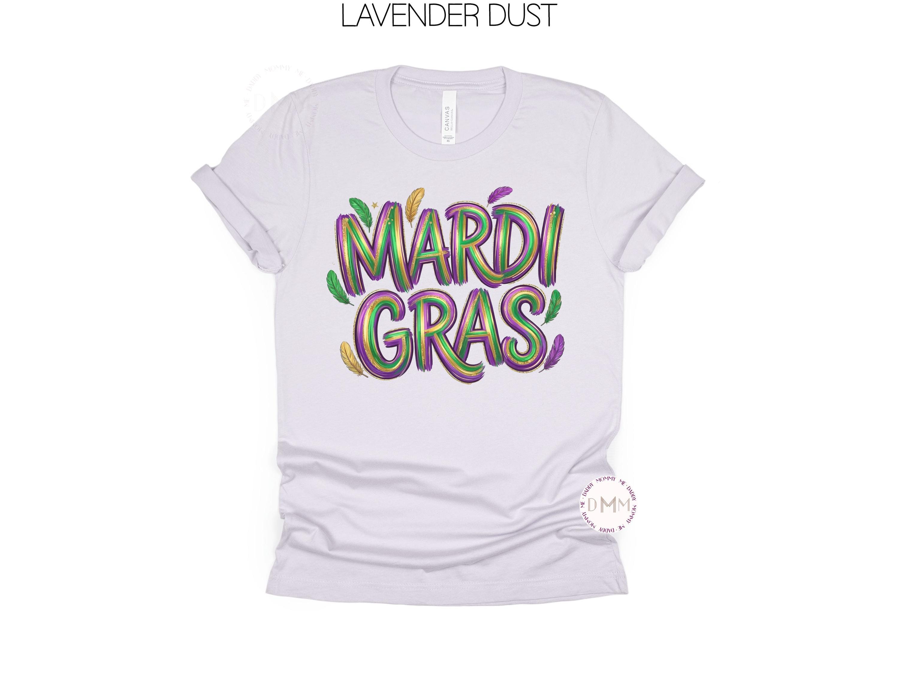Celebrate Mardi Gras in style with this festive Mardi Gras graphic tee featuring bold lettering in classic purple, green, and gold with feather accents. Perfect for Fat Tuesday, parades, festivals, parties, or everyday wear during carnival season!