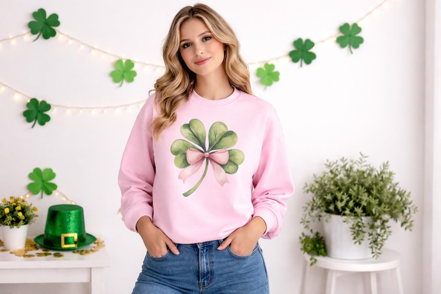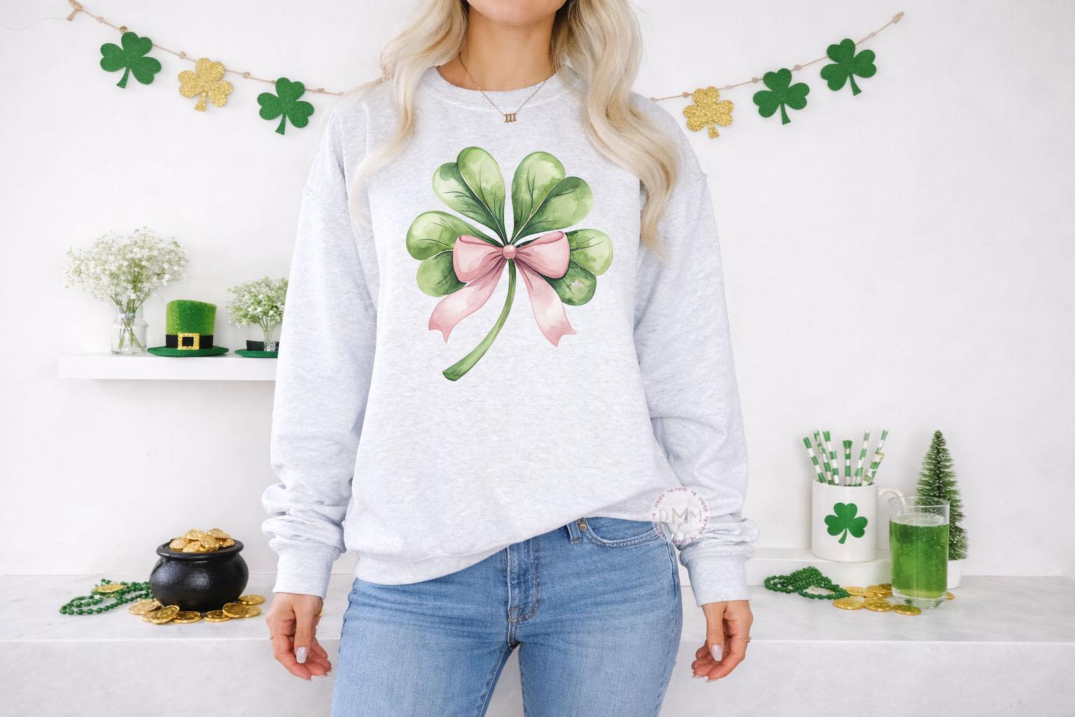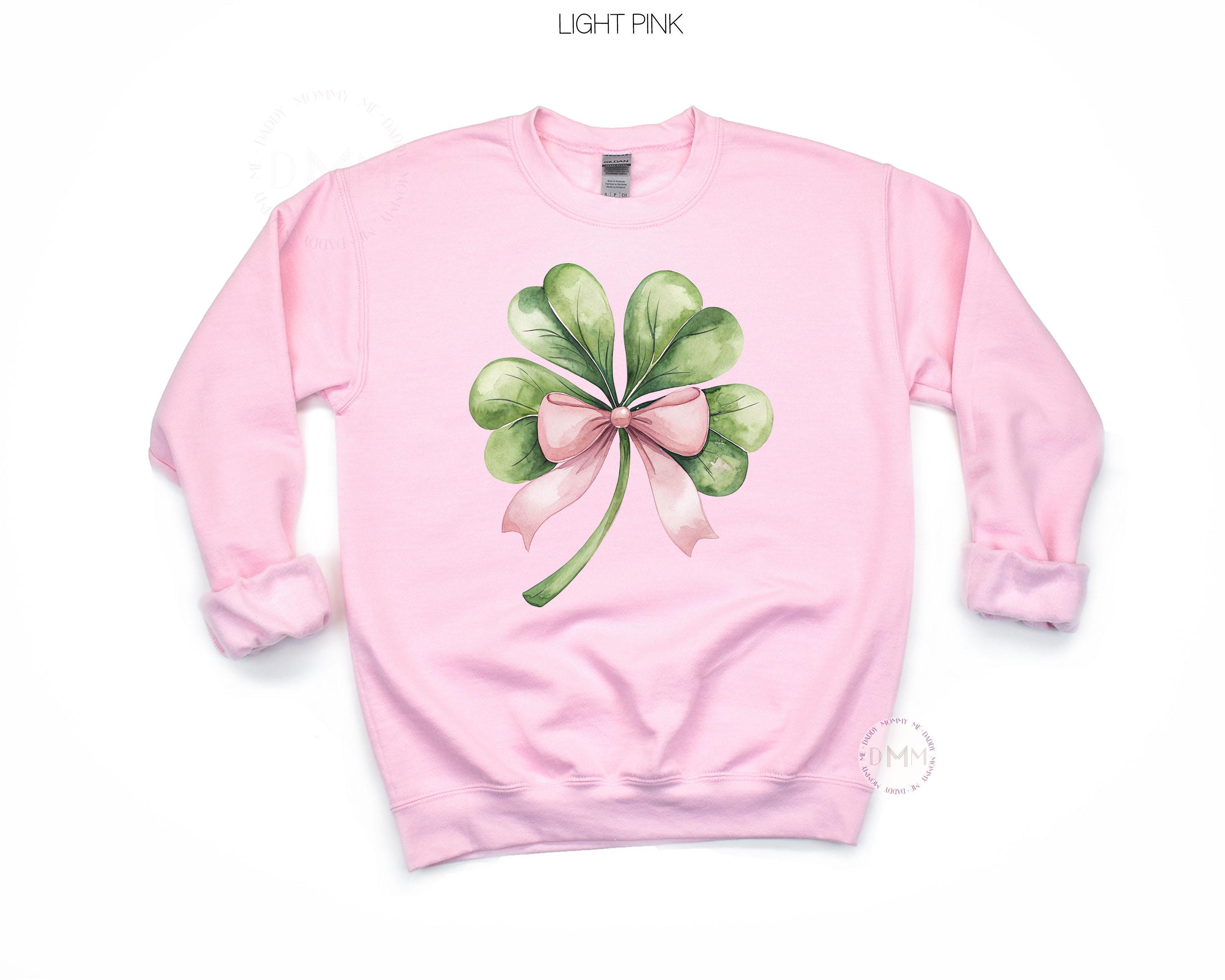 St Patrick’s Day Sweatshirt for Women | Pink Shamrock Bow Crewneck | Cute Coquette Clover Pullover | Lucky Girl Irish Spring Top