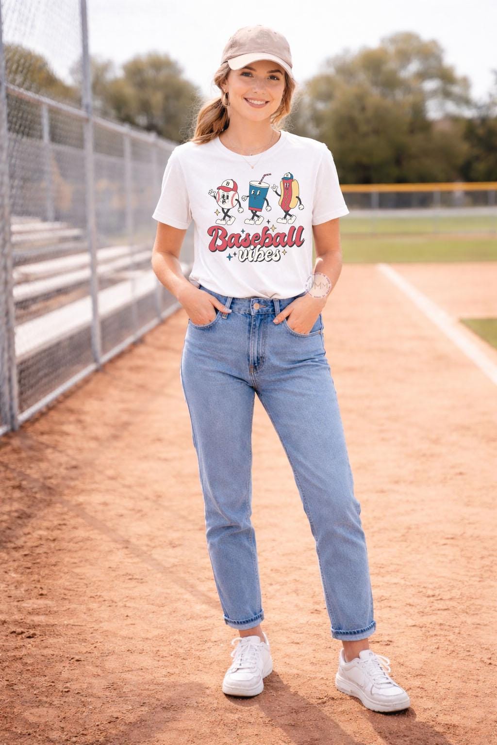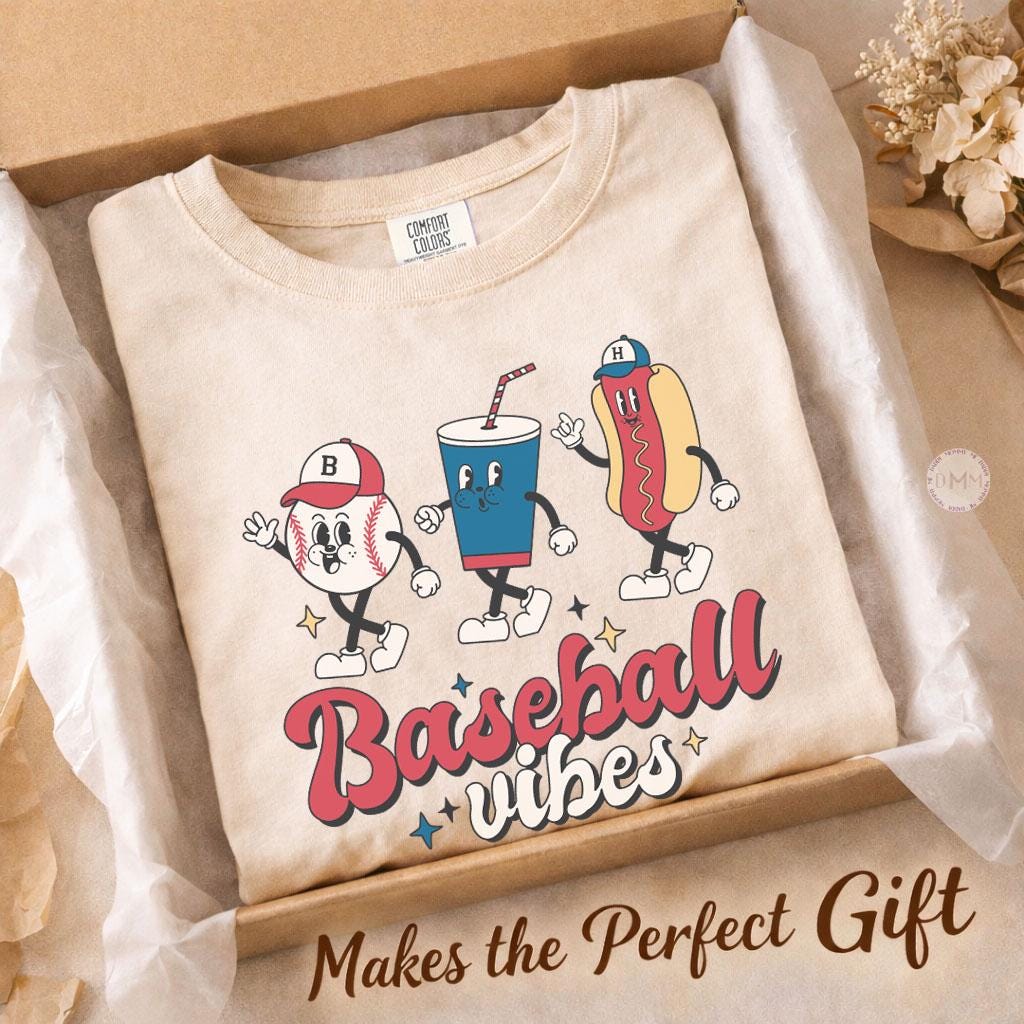 Baseball Vibes Comfort Colors® Tee. Bring the fun of game day wherever you go! This adorable Baseball Vibes shirt features playful baseball, soda, and hotdog characters that capture the classic ballpark experience. Perfect for baseball moms, fans, and anyone who loves spending evenings at the field.