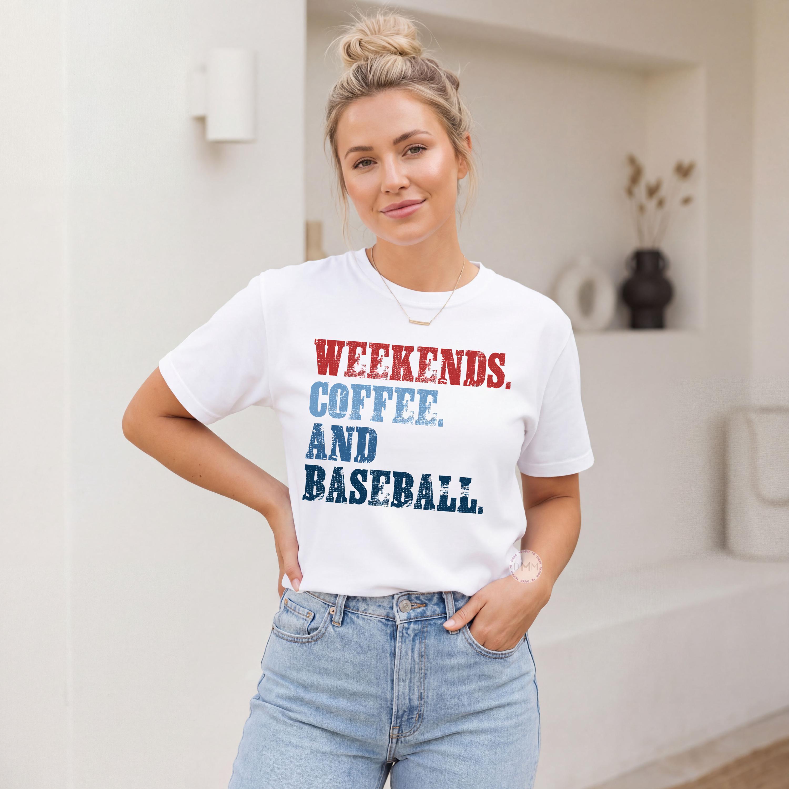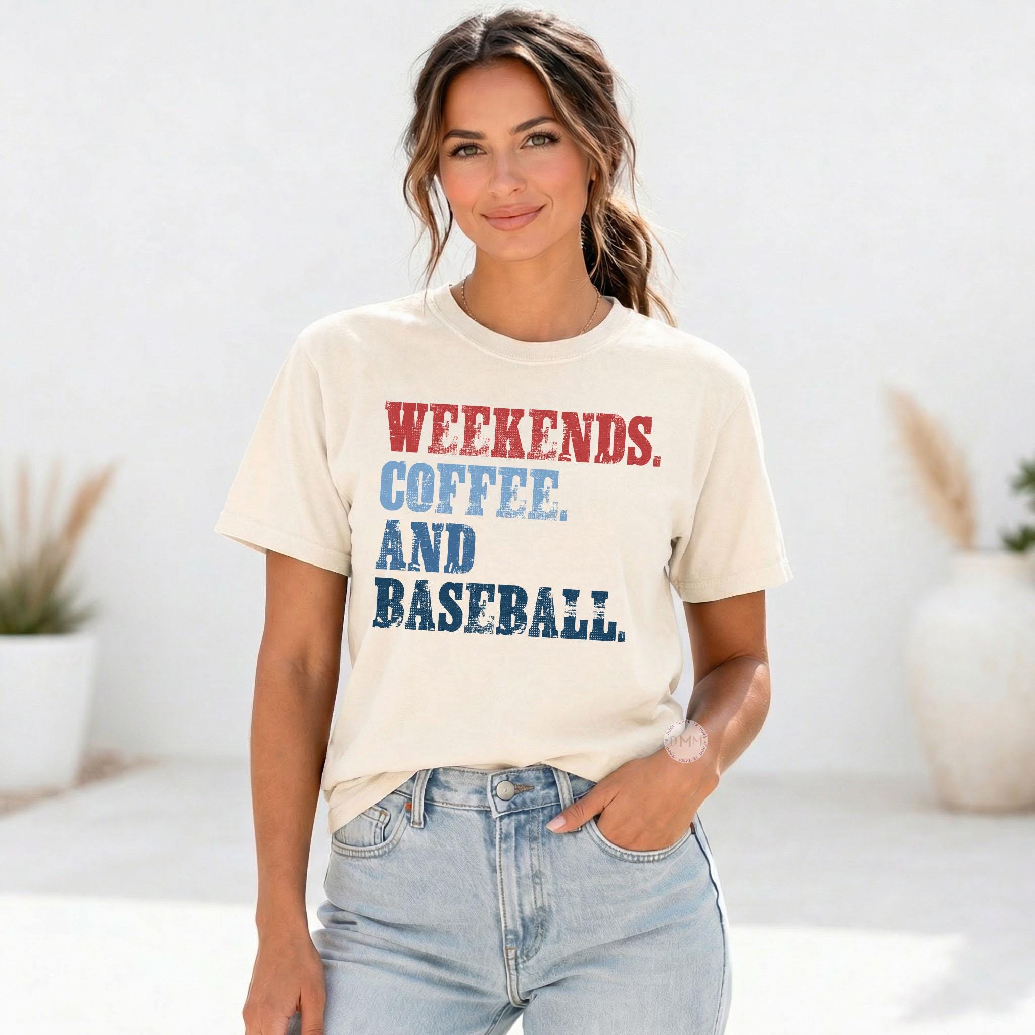 Weekends. Coffee. And Baseball. The perfect relaxed-fit Comfort Colors tee for game days, busy moms, and baseball lovers ⚾