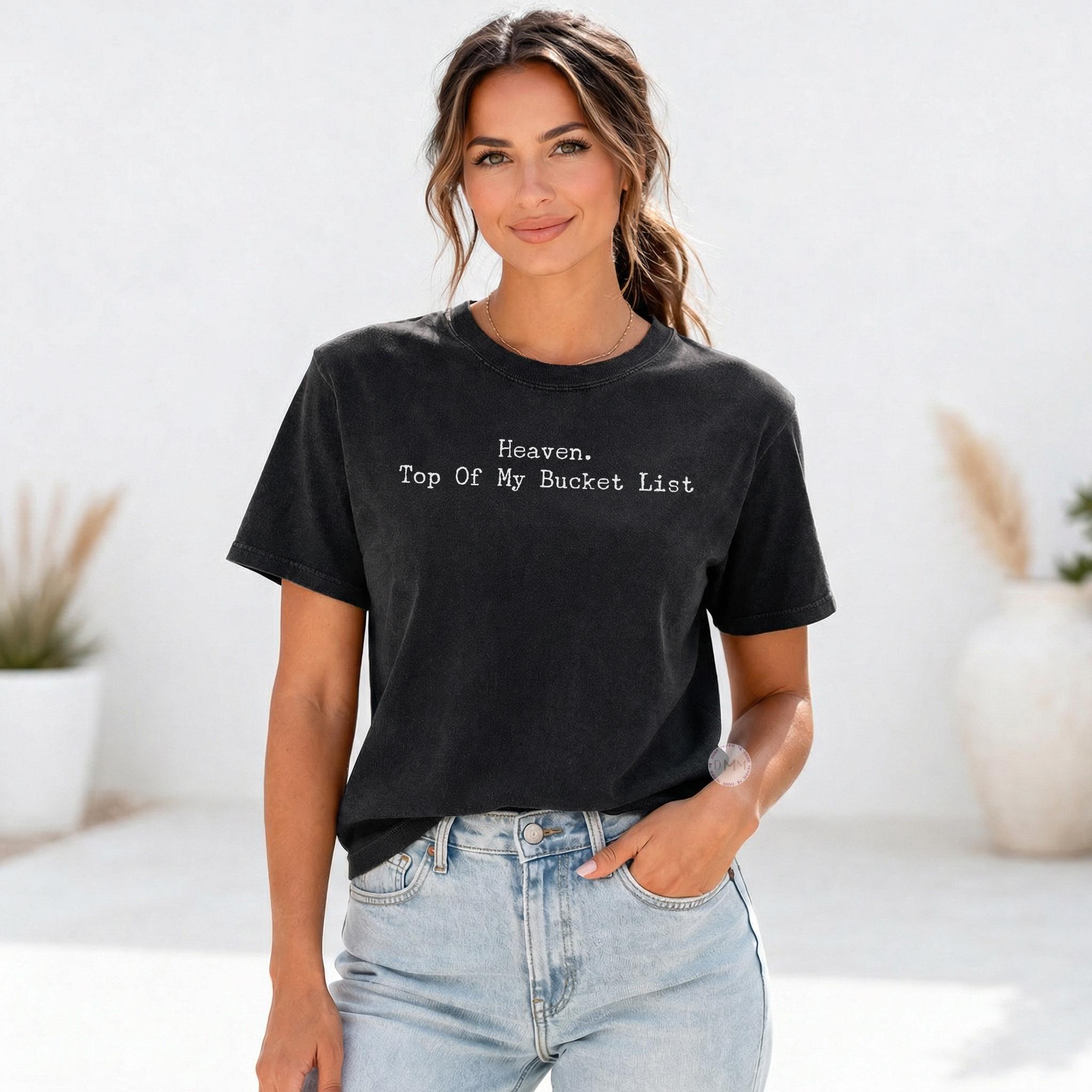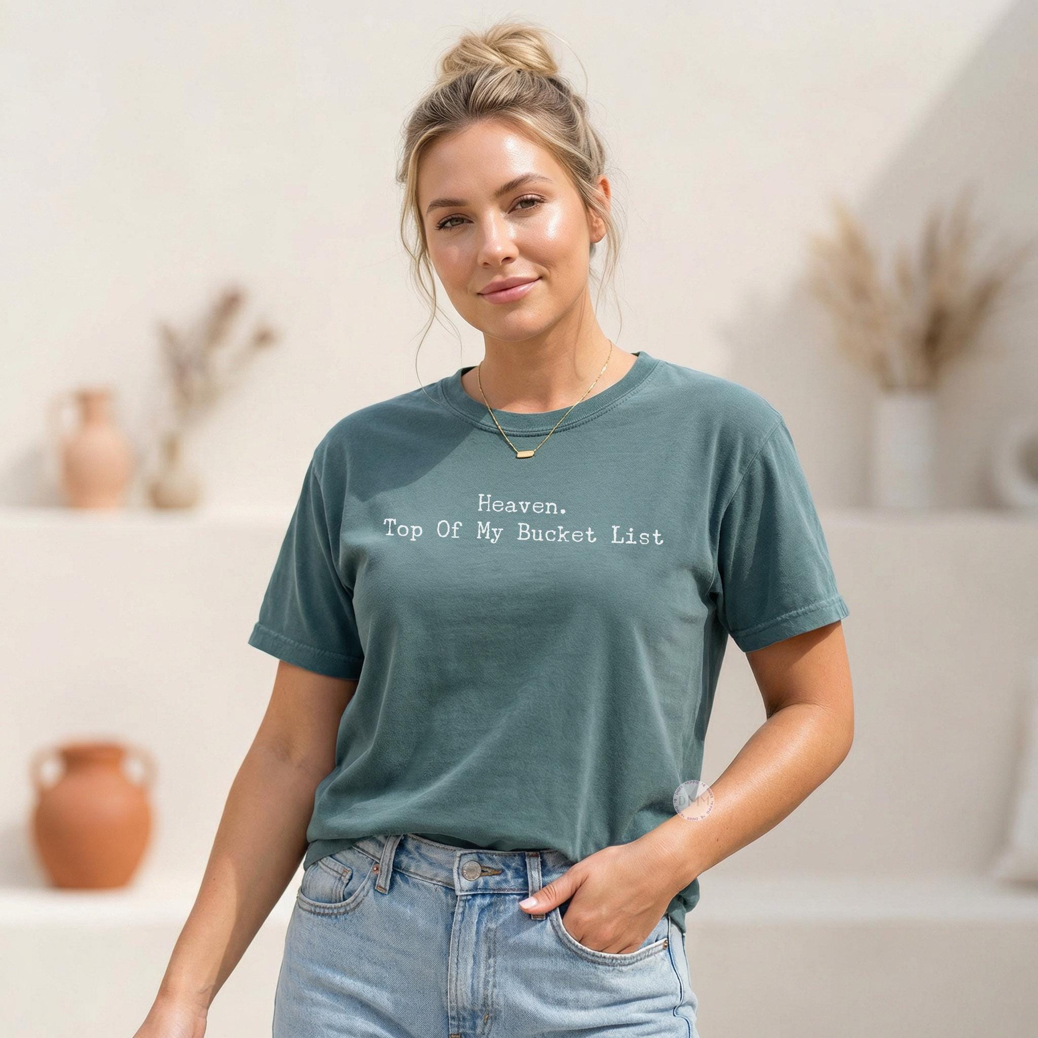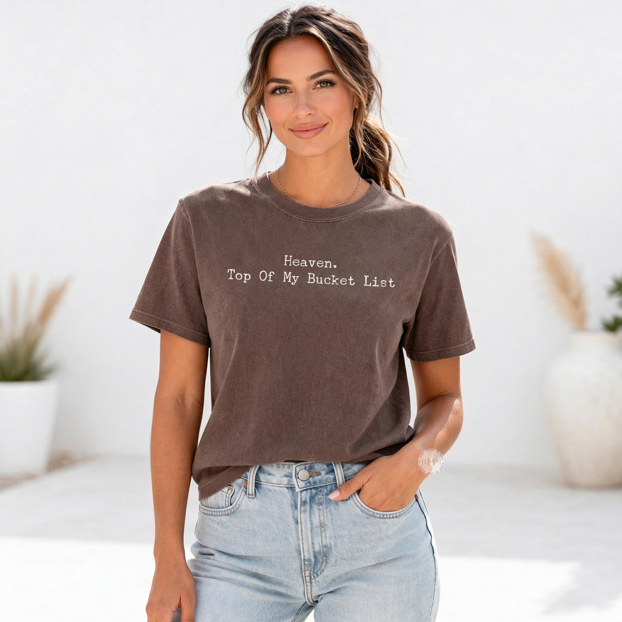 Faith-inspired Comfort Colors shirt featuring “Heaven Top Of My Bucket List” – soft, vintage-style tee perfect for everyday wear or a meaningful gift.